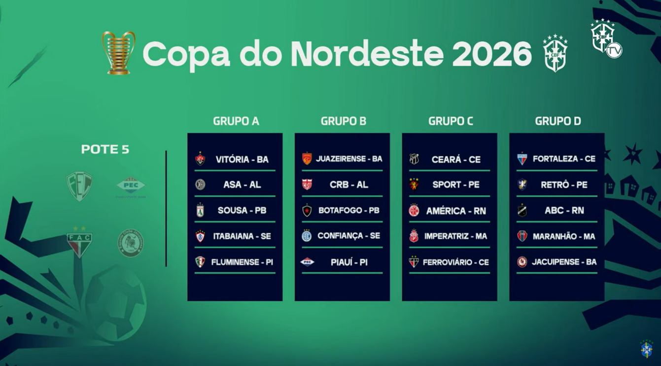 O sorteio da Copa do Nordeste 2026 aconteceu na tarde desta terça-feira e definiu os grupos da principal competição regional. A edição deste ano mantém o formato com 20 equipes divididas em quatro grupos, com cinco clubes em cada chave. No entanto, os times não enfrentam os adversários do próprio grupo na primeira fase. Os confrontos acontecem contra as equipes do grupo correspondente.