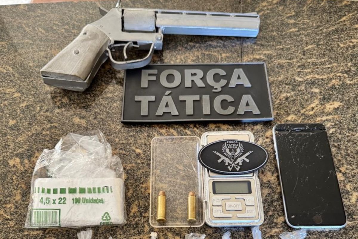 Com os dois, os militares encontraram uma bolsa contendo entorpecentes e diversos materiais associados ao tráfico de drogas. Além disso, a equipe apreendeu um revólver artesanal calibre .38 com duas munições intactas.