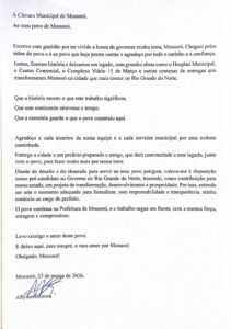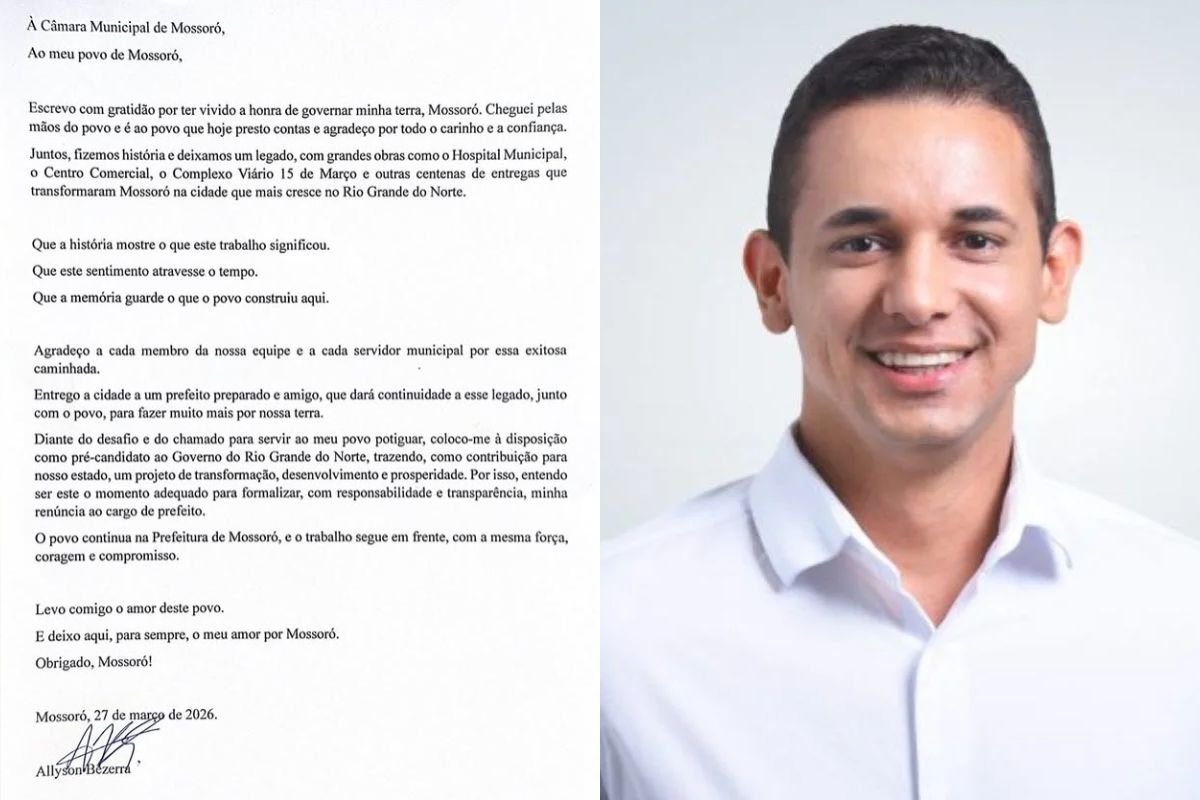 Em carta direcionada à Câmara Municipal e à população mossoroense, Allyson destacou gratidão pelo período à frente da administração municipal e afirmou que deixa o cargo para assumir um novo desafio político.