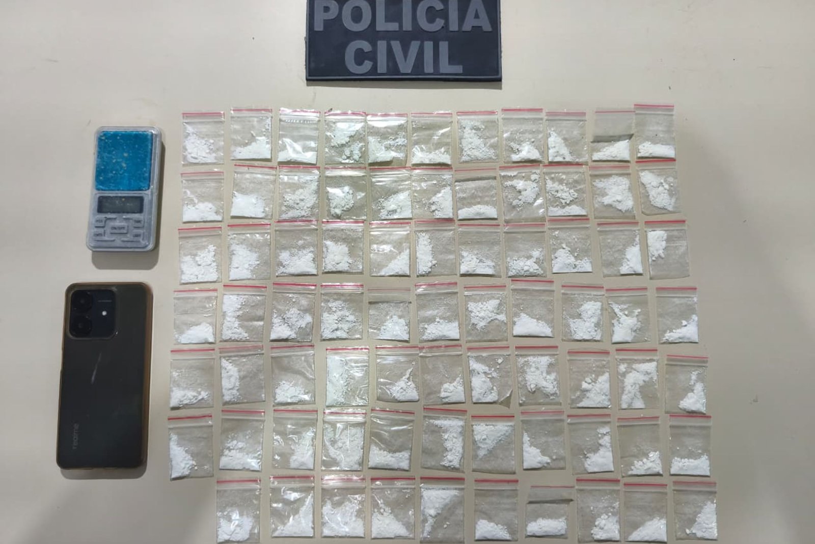 Durante a ação, foram apreendidas 76 porções de cocaína, fracionadas em embalagens de ziplock, uma balança de precisão e um aparelho celular. Todo o material foi apreendido e será objeto de averiguação.