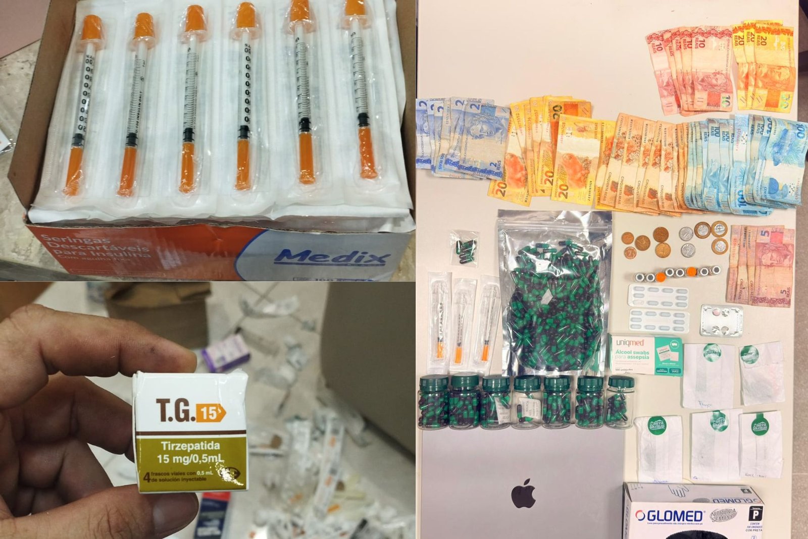 Durante as diligências, foram apreendidos materiais relacionados à atividade criminosa, como seringas, luvas, recipientes térmicos utilizados para entrega dos produtos, aparelhos eletrônicos e dinheiro em espécie. Os itens serão submetidos à perícia.