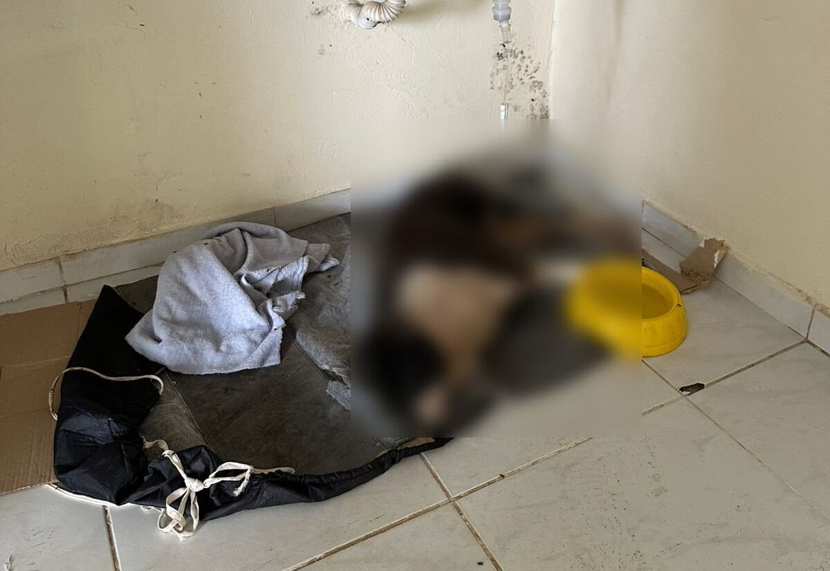 De acordo com o relato, o animal estava em um quarto nos fundos do prédio, deitado sobre “trapos velhos” e cercado por moscas. Além disso, ainda apresentava um acesso venoso na pata e permanecia preso a uma caixa de papelão, amarrado com uma luva.