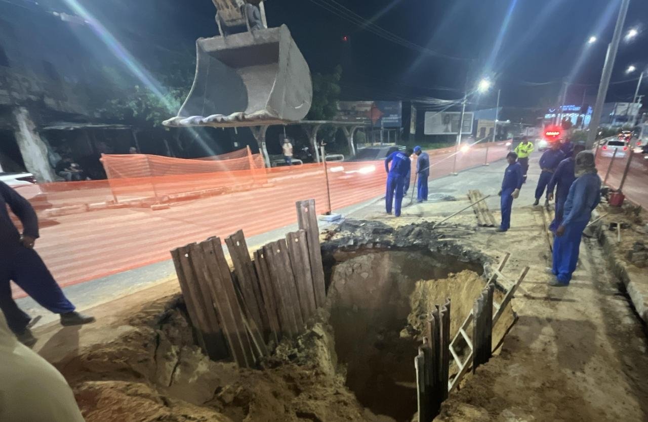 Durante a execução do serviço, as equipes conseguiram acessar a tubulação, que fica a cerca de cinco metros de profundidade. Em seguida, os técnicos identificaram o rompimento de três estruturas da rede de drenagem.