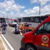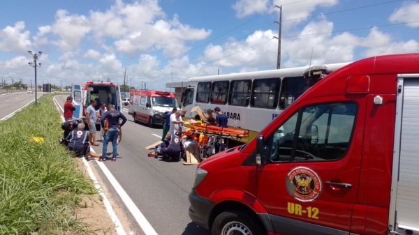Um acidente entre um ônibus e uma motocicleta na BR-101, sentido da Av. Moema Tinoco, deixou duas pessoas feridas e o trânsito parado, na...